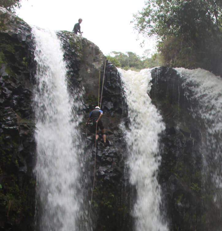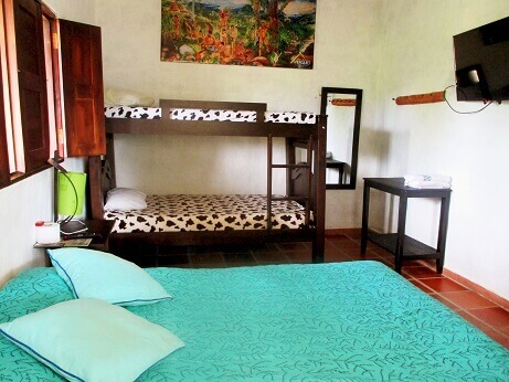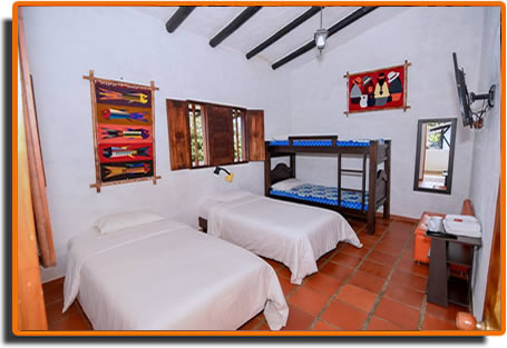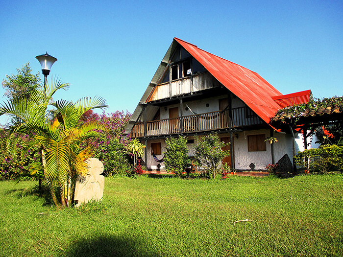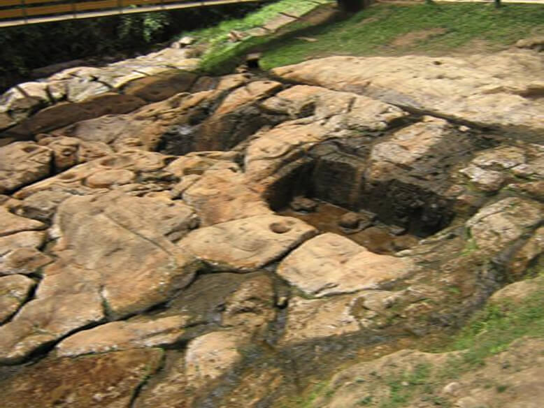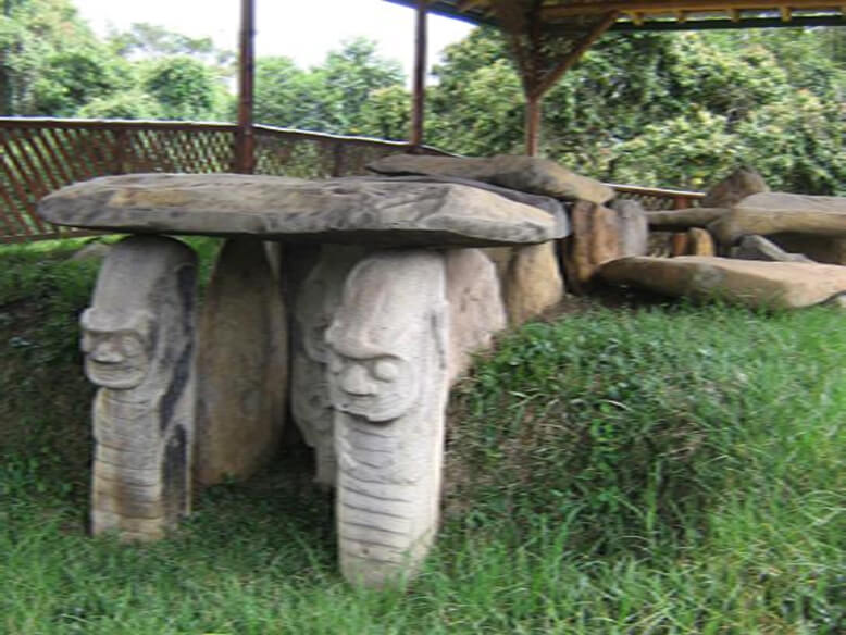 Un poco arriba del comienzo de los canales se desprende otro transversalmente, de 8,50 metros de longitud, 25 cms de ancho y de profundidad; este canal presenta tres aberturas sobre un lado, de tal manera calculadas, que el agua que sale por cada una de ellas es del mismo caudal que el arrojado por las otras. Saliendo de estas bocas y por causa de múltiples y pequeños canales, las aguas formas pequeñas cascadas para recorrer luego algún espacio por canales más profundos o angostos, ya sean rectos o en zig zag, llenando a su paso algunos huecos cilíndricos para caer de nuevo en cascada, gracias a la presencia de múltiples subdivisiones, en tres piscinas rectangulares, la más grande de las cuales mide 3,10 metros de longitud, 1,23 metros de anchura y 80 cms. de profundidad. Figuras humanas y animales en relieve, de las cuales las más notables son un indígena en pie coronado de plumas, un simio con la cola levantada y una gran cara humana decoran una de las piscinas, en cuyo fondo se levanta el busto de un renacuajo cuya cola al subir por uno de los cortes se abre en dos dejando espacio a la gran cara humana y semejando así como de brazos levantados. Pequeños cuadrúpedos, lagartos, renacuajos y serpientes estilizadas de diferentes modos, enrollados, alargadas o formando varios círculos, complementan la admirable decoración de este lugar, en cuya parte superior también se nota una especie de eslabel con un brazo humano al lado rematando en dos piernas humanas, como si fuera trono o altar para un sacrificio desconocido y misterioso a las divinidades del agua, culto que está bien claro en todo el conjunto de este admirable monumento.